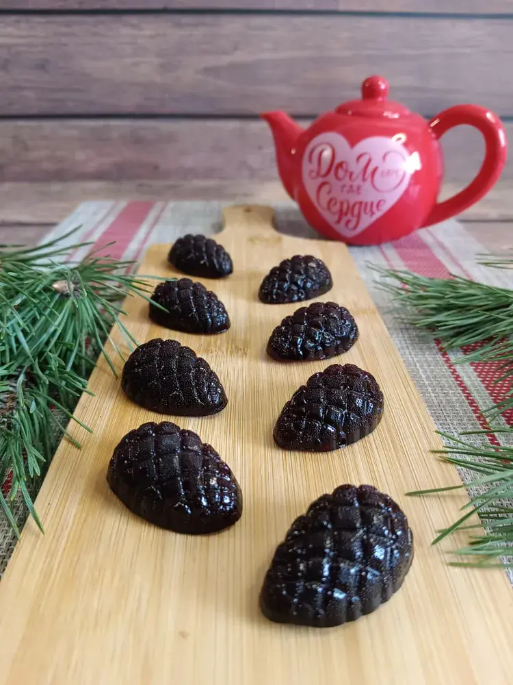 Сахар, отвар сосновый (вода, молодая сосновая шишка), патока, пектин, лимонная кислота, имбирь молотый, корица, глянцеватель (раст.масло, пчелиный воск)