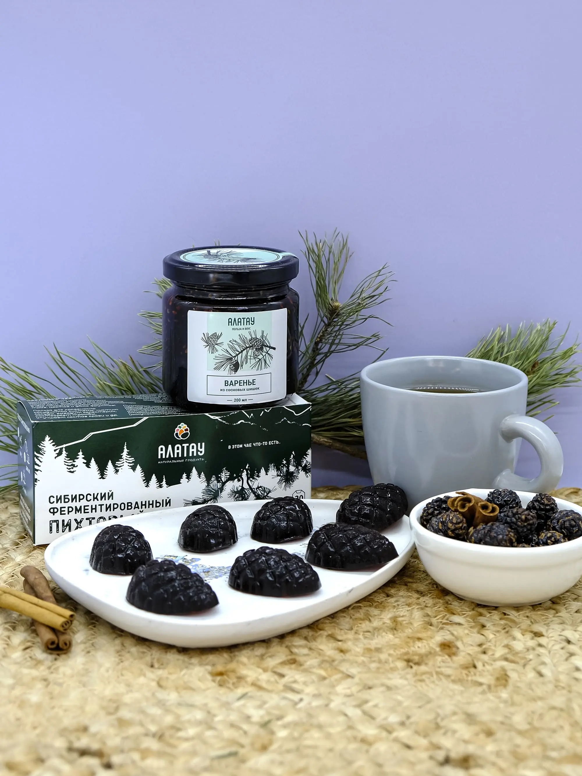 Сахар, отвар сосновый (вода, молодая сосновая шишка), патока, пектин, лимонная кислота, имбирь молотый, корица, глянцеватель (раст.масло, пчелиный воск)