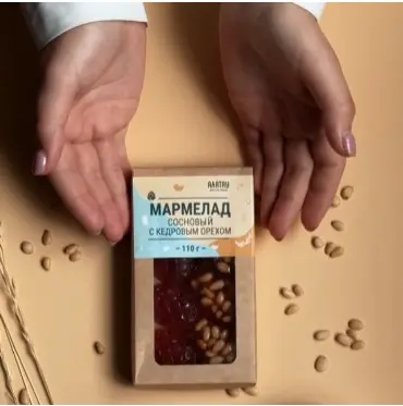 Сахар, отвар сосновый (вода, молодая сосновая шишка), патока, пектин, орех кедровый, лимонная кислота, глянцеватель (раст.масло, пчелиный воск)