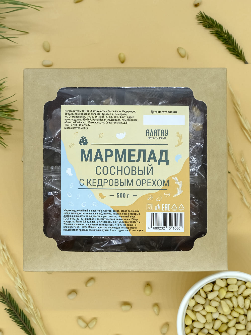 Сахар, отвар сосновый (вода, молодая сосновая шишка), патока, пектин, орех кедровый, лимонная кислота, глянцеватель (раст.масло, пчелиный воск)