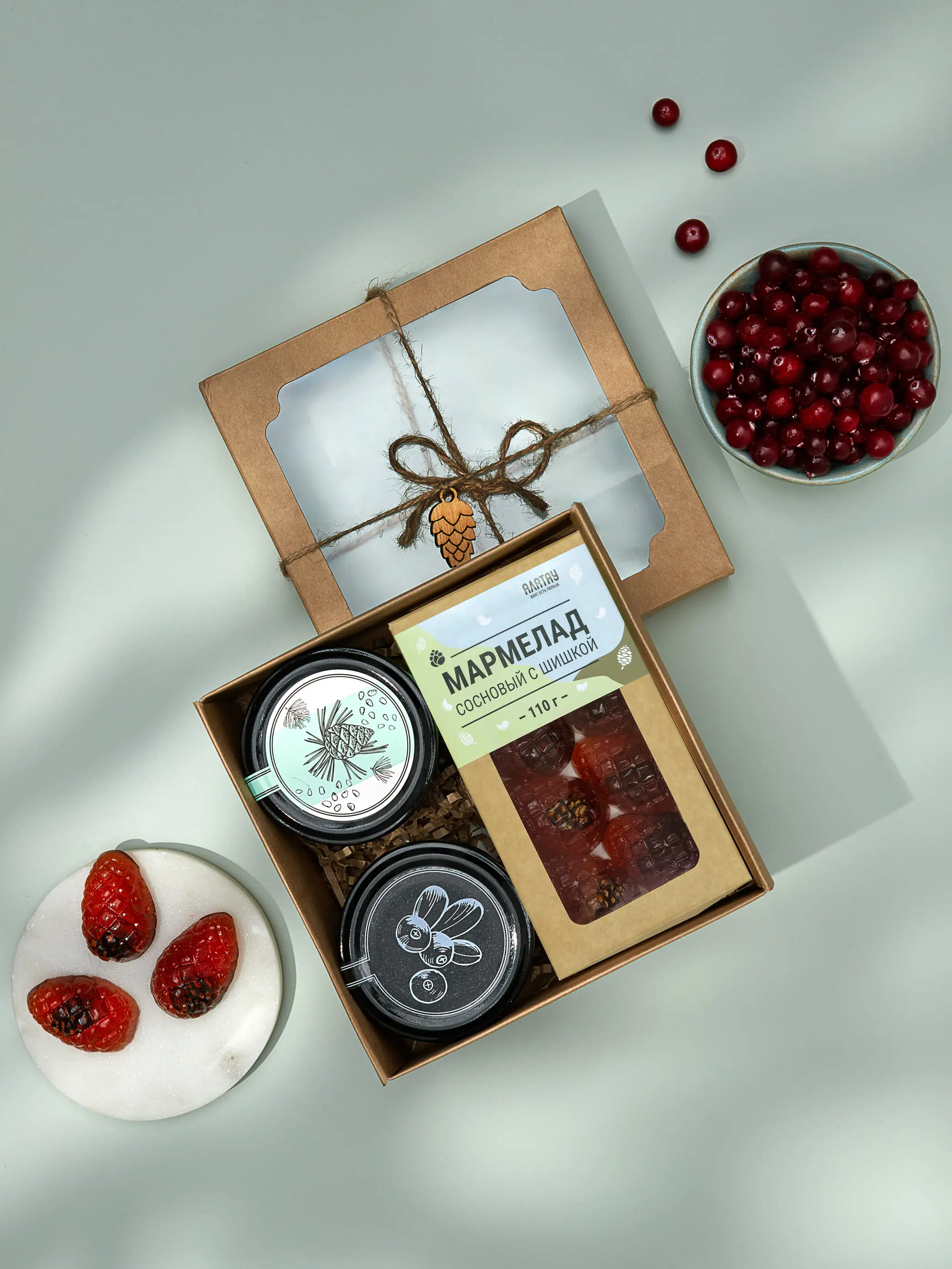 Варенье из сосновых шишек с кедровым орехом - 100 мл, Брусника в сосновом сиропе - 100 мл, Мармелад с сосновой шишкой - 110 гр |