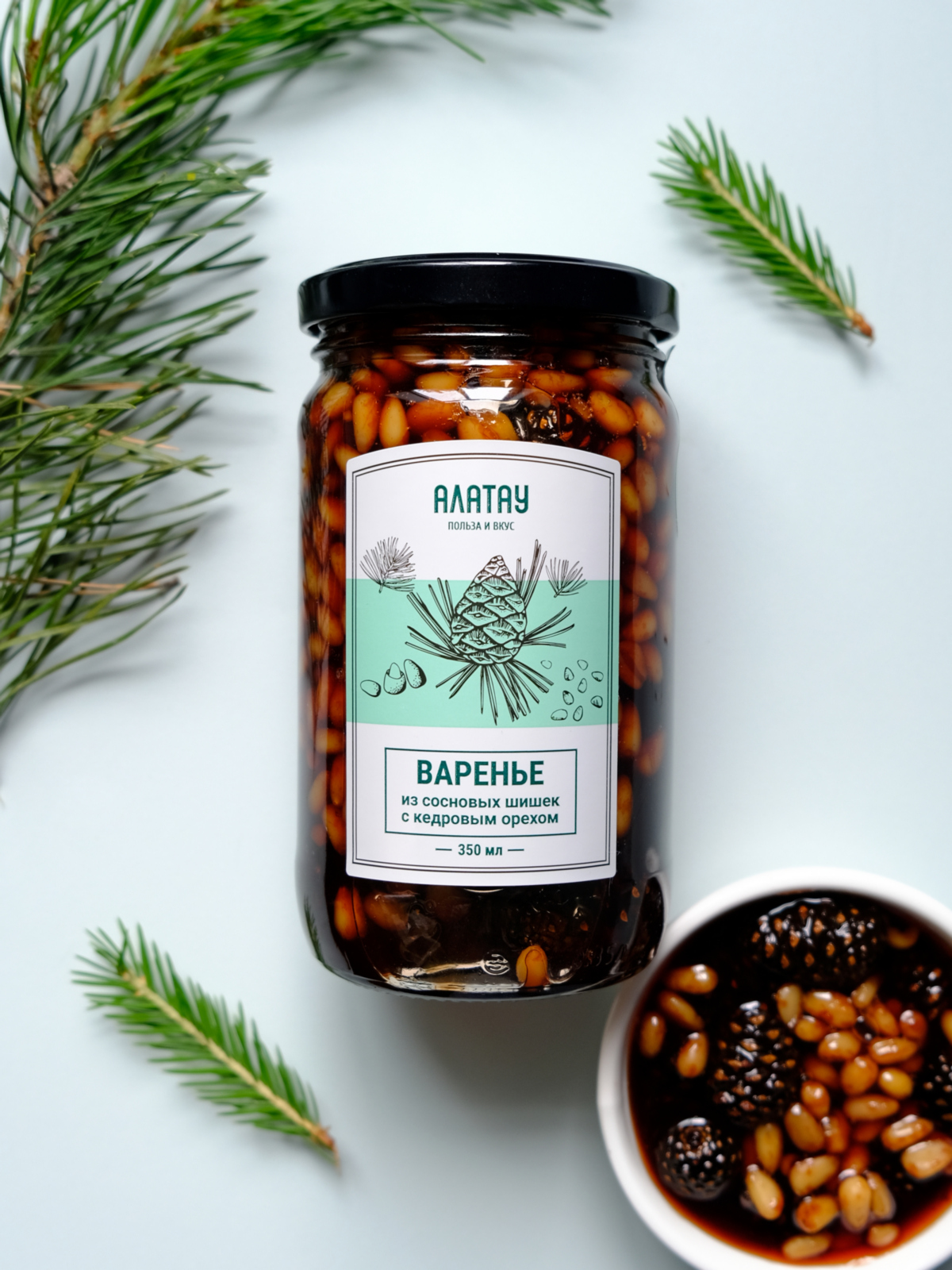 Шишки и кедровые орехи вместе усиливают эффект от таежного варенья. Улучшают сон и заряжают бодростью. Укрепляют дыхательную и сердечно-сосудистую систему. Улучшают работу головного мозга. Это оригинальный топпинг для разных блюд - от блинчиков до творога. Завтраки станут интереснее. А вечерние чаепития еще задушевнее. Ощутите единение с природой и наполнитесь энергией с вареньем из шишек Алатау